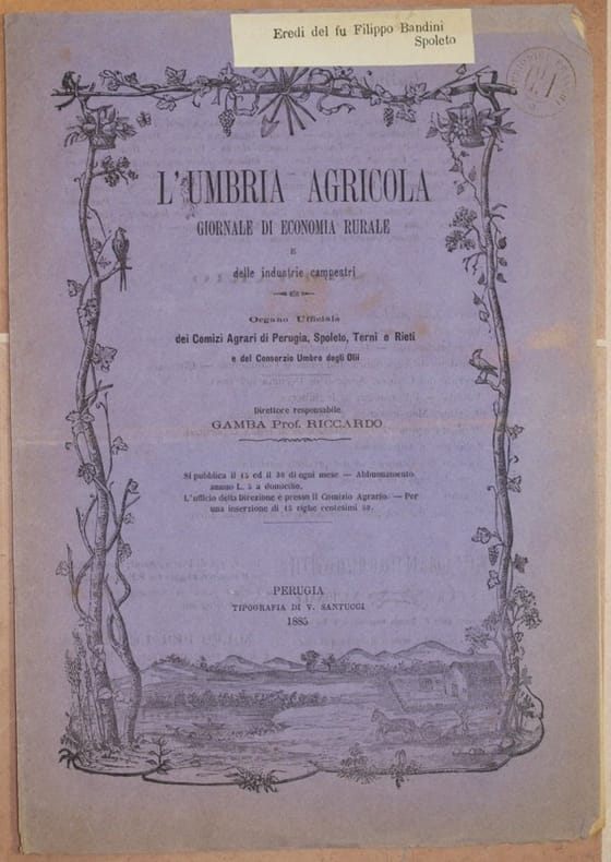 In 4. Dim. 28x19,5 cm. Pp. da 81 a 88. Numero del 15 giugno 1885 de "L'Umbria agricola", rivista bisettimanale di economia rurale diretta da Riccardo Gamba. La rivista conteneva numerosi articoli di agricoltura e allevamento, molti di interesse locale. In questo numero: La società dei viticoltori italiani, Importazione ed esportazione, Conferenza a Roma sulla coltivazione del grano, Concimi chimici a prodotto, Circolare sulla peronospora, Concorso agrario regionale a Siena ecc... Etichetta al piatto anteriore. Brossura editoriale originale. Brossura editoriale in buone condizioni generali con usure e parti mancanti ai margini e dorso. Piegatura orizzontale. Legatura assente. Pagine in buone condizioni con rare fioriture. Piegature ed usure marginali. Number of the 15th of June 1885 of "L'Umbria agricola", biweekly magazine of rural economy directed by Riccardo Gamba. The magazine contained different articles of agriculture and breeding, many of them of local interest. In this number: La società dei viticoltori italiani, Import and export, Conference in Rome about grain cultivation, Chemichal fertilizers, Information about peronospora, Regional agricultural prize in Siena ecc...<BR> Editorial original cover. Editorial cover in good general conditions with wearings and missing parts in the edges and spine. Horizontal folding. Binding is missing. Pages are in good conditions with foxings. Foldings and wearings in the edges.