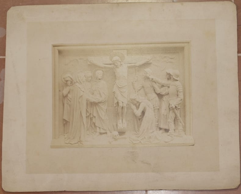 Bella fotografia all'albumina della fine del XIX secolo che mostra un bassorilievo di una stazione della Via Crucis. La foto è applicata su cartoncino coevo. In buone condizioni, fioriture, mende e alcune parti mancanti al cartoncino. Di grandi dimensioni. Dim. cartone cm 30,5x38. Dim. foto cm 17x22,6 Very beautiful albumine photo of the end of XIX century showing a bas-relief of a station of Via Crucis. The photo is applied on coeval carton base. In good conditions, foxings and usage signs, missing parts in the carton base. Big size.