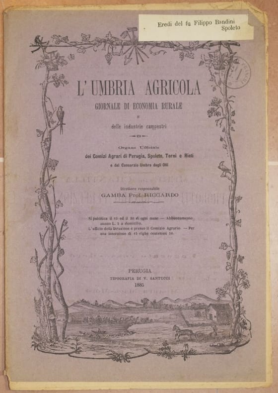 In 4. Dim. 28x19,5 cm. Pp. da 105 a 120. Numero del 30 luglio e 15 agosto 1885 de "L'Umbria agricola", rivista bisettimanale di economia rurale diretta da Riccardo Gamba. La rivista conteneva numerosi articoli di agricoltura e allevamento, molti di interesse locale. In questo numero: Conferenze a Perugia, Le trebbiatrici a Pesaro, Concorso di alunni alla Regia Scuola Pratica di agricoltura di Roma, Consiglio di agricoltura, Congresso degli agricoltori marchigiani, Discorso dei militari a PEsaro, La peronospora sui grappoli, L'inchiesta ornitologica, Esposizione orticola romana ecc... Etichetta al piatto anteriore. Brossura editoriale originale. Brossura editoriale in buone condizioni generali con usure e parti mancanti ai margini e dorso. Piegatura orizzontale. Legatura assente. Pagine in buone condizioni con rare fioriture. Piegature ed usure marginali. Number of the 30th of July and 15th of august 1885 of "L'Umbria agricola", biweekly magazine of rural economy directed by Riccardo Gamba. The magazine contained different articles of agriculture and breeding, many of them of local interest. In this number: Conferences in Perugia, Threshers in Pesaro, Prize of students in Regia Scuola Pratica di agricoltura in Rome, Council of agriculture, Congress of agriculturers of Marche, Speech of soldiers in PEsaro, peronospora in grapes, Ornythological report, Roman agricultural exposition ecc... Editorial original cover. Editorial cover in good general conditions with wearings and missing parts in the edges and spine. Horizontal folding. Binding is missing. Pages are in good conditions with foxings. Foldings and wearings in the edges.