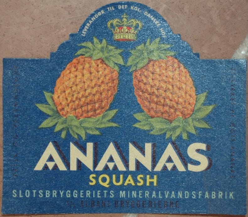 Bella etichetta di un succo d'ananas danese. L'etichetta mostra due ananas, elfi e la corona danese. In buone condizioni. Formato cm. 7,5x8,5. Beautiful label of a danish ananas squash. The label show two fruits, elfs and danish crown. In good conditions.