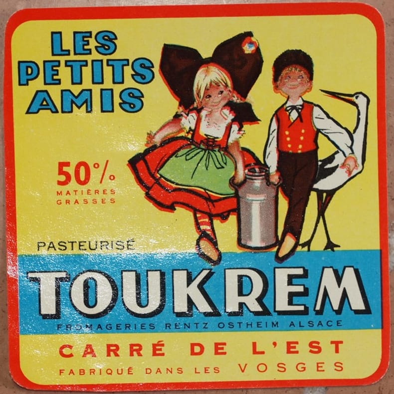 Bella etichetta del formaggio francese "Les Petits amis". Senza data ma degli anni '60. L'etichetta mostra due bambini con una cicogna e del latte. In buone condizioni. Formato cm. 7,5x7,5. Beautiful luggage labels of the french cheese "Les Petits amis". Not dated but of 1960's. The label show two children with a stork and some milk. In good conditions.