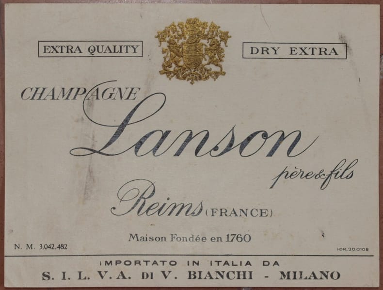 Bella etichetta dello champagne "Lanson pere & fils" prodotto a Reims. In buone condizioni. Formato cm. 9,5x12,5. Beautiful label of champagne "Lanson pere & fils" produced in Reims. In good conditions.
