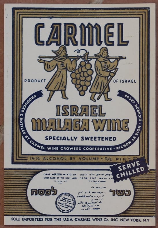 Bella etichetta del vino israeliano Carmel Israel Malaga wine. Senza data ma degli anni '70. Bella grafica. In ottime condizioni. Formato cm. 9,5x6,5. Beautiful label of Israel wine Carmel Israel Malaga wine. Not dated but of 1970's. Beautiful graphics. In good conditions.