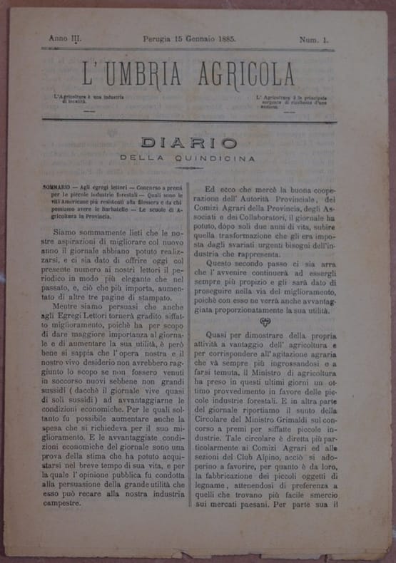 In 4. Dim. 28x19,5 cm. Pp. da 1 a 8. Numero del 15 gennaio 1885 de "L'Umbria agricola", rivista bisettimanale di economia rurale diretta da Riccardo Gamba. La rivista conteneva numerosi articoli di agricoltura e allevamento, molti di interesse locale. In questo numero: Concorso a premi per le piccole industrie forestali, Quali sono le viti americane più resistenti alla filossera e da chi possiamo avere le barbatelle, Le scuole di agricoltura in Provincia ecc... Brossura editoriale assente. Brossura editoriale assente. Piegatura orizzontale. Legatura assente. Pagine in buone condizioni con rare fioriture, qualcuna ancora unita. Piegature ed usure marginali. Number of the 15th of january 1885 of "L'Umbria agricola", biweekly magazine of rural economy directed by Riccardo Gamba. The magazine contained different articles of agriculture and breeding, many of them of local interest. In this number: Prize for little wood firms, Most resistant american grapes, Schools of agriculture ecc... Editorial cover is missing. Editorial cover is missing. Binding is missing. Pages are in good conditions with foxings, some still bound. Foldings and wearings in the edges.