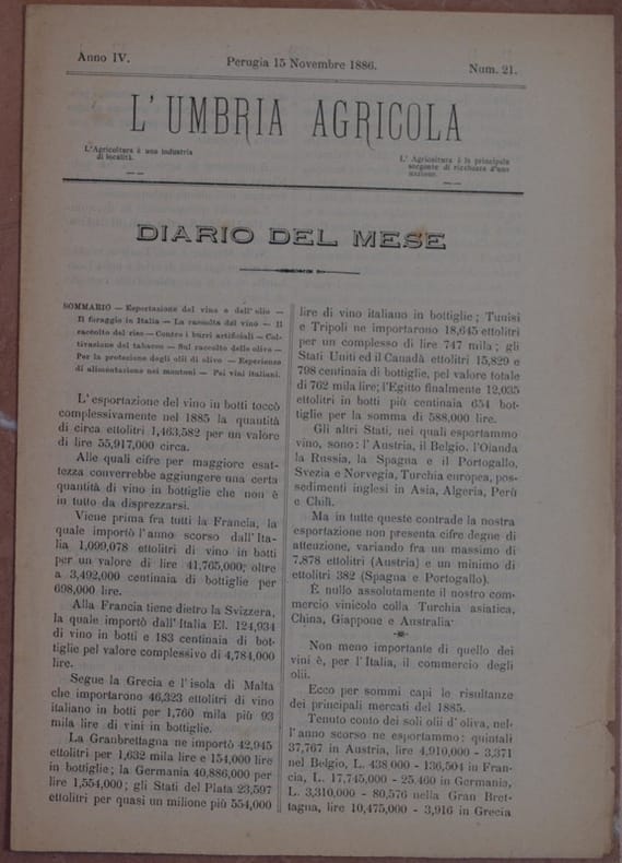In 4. Dim. 28x19,5 cm. Pp. da 161 a 168. Numero del 15 novembre 1885 de "L'Umbria agricola", rivista bisettimanale di economia rurale diretta da Riccardo Gamba. La rivista conteneva numerosi articoli di agricoltura e allevamento, molti di interesse locale. In questo numero: Esportazione del vino e dell'olio, Il foraggio in Italia, La raccolta del vino, Il raccolto del riso, Contro i burri artificiali, Coltivazione del tabacco, Sul raccolto delle olive, Per la protezione degli olii di olivo, Esperienze di alimentazione nei montoni, Pei vini italiani ecc... Brossura editoriale assente. Brossura editoriale assente. Piegatura orizzontale. Legatura assente. Pagine in buone condizioni con rare fioriture, qualcuna ancora unita. Piegature ed usure marginali. Number of the 15th of november 1885 of "L'Umbria agricola", biweekly magazine of rural economy directed by Riccardo Gamba. The magazine contained different articles of agriculture and breeding, many of them of local interest. In this number: Export of wine and oil, Wine harvesting, Il raccolto del riso, Against artificial butter, Cultivation of tobacco, Harvesting of olives, For protection of olive oil, Experiences of food male sheeps, For italian wines ecc... Editorial cover is missing. Editorial cover is missing. Binding is missing. Pages are in good conditions with foxings, some still bound. Foldings and wearings in the edges.