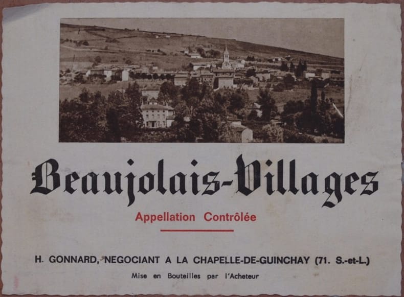 Bella etichetta del vino "Beaujolais Villages". Bella veduta del paese. In ottime condizioni. Formato cm. 9x12,5. Beautiful label of wine "Beaujolais Villages". Beautiful view. In very good conditions.