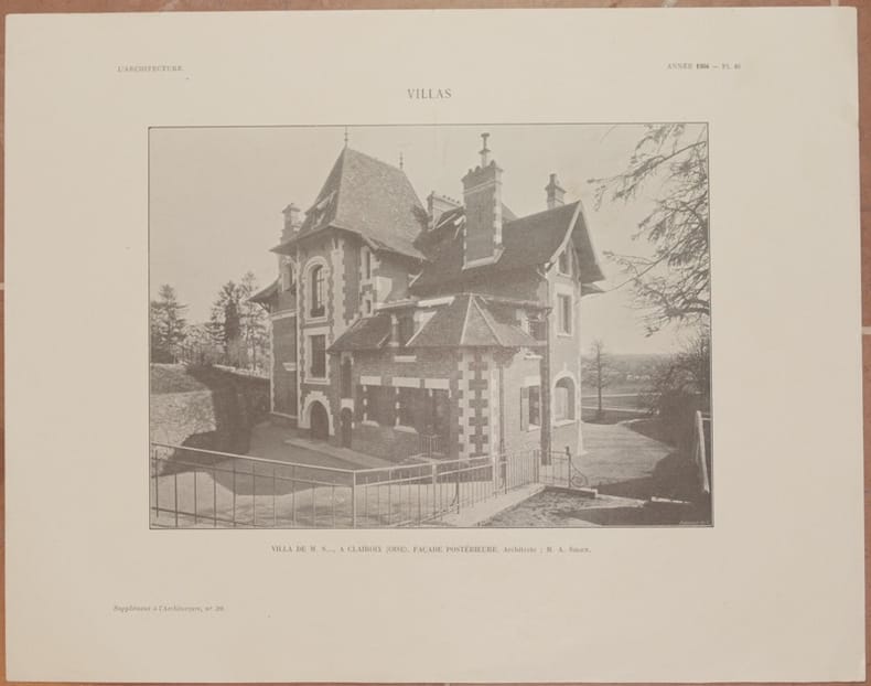Bella litografia di architettura supplemento de "L'architecture" del 1904. La stampa mostra una villa a Clairoix, Oise dell'architetto Sibien. TECNICA: Litografia DIMENSIONI FOGLIO: cm 27,5x3 DIMENSIONI INCISIONE: cm 17x23 EPOCA: 1905 CONDIZIONI: Buone condizioni. Fioriture e strappi marginali Beautiful lythography of 1904 taken from the work "L'architecture" of 1904. The print shows a villa in Clairoix, Oise. TECHNIQUE: Lythography PAGE SIZE: cm 27,5x35 PRINT'S SIZE: cm 17x23 PERIOD: 1905 CONDITION: good conditions. Foxings