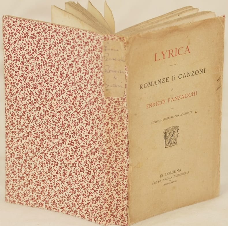 In 16. Dim. 16,5x10,5 cm. Pp. 206. Seconda edizione del 1878 di questa raccolta di liriche del poeta, critico d'arte e critico musicale Enrico Panzacchi (1840-1904) nato a Ozzano dell'Emilia. Panzacchi fu professore di storia al Liceo Azuni di Sassari. L'opera è costitutita da liriche inedite o già apparse singolarmente su riviste o in opuscolo. Tra le liriche presenti: da Portotorres, MAssimo D'Azeglio, Vincenzo Caldesi, Napoleone III, Giuseppe Mazzini, Marchesa Virginia De Luca, Primo Alessandro Muratori, Adolfo Gozzi, Contessa Paolina Ranieri Biscia, Giulia Maiani, Costantino dall'Argine, Goldoni in Bologna ecc... Alcune decorazioni all'interno. Copertina cartonata con brossura applicata e titolo manoscritto al dorso in buone condizioni generali con usure e strappi ai margini e dorso. Legatura in buone condizioni. All'interno le pagine si presentano in buone condizioni con fioriture. Alcune lievi gore d'umidità. Second edition of 1878 of this collection of lyrics by the poet, art critic and musical critic Enrico Panzacchi (1840-1904) born in Ozzano dell'Emilia. Panzacchi was teacher of history in Secondary School Azuni in Sassari. The work is amde up of inedit lyrics or lyrics appeared singularly on magazines and pamphlets. Between the lyrics inside: from Portotorres, Massimo D'Azeglio, Vincenzo Caldesi, Napoleone III, Giuseppe Mazzini, Marchesa Virginia De Luca, Primo Alessandro Muratori, Adolfo Gozzi, Contessa Paolina Ranieri Biscia, Giulia Maiani, Costantino dall'Argine, Goldoni in Bologna etc... Some decorations inside. Carton cover with editorial cover applied and manuscripted title in the spine in good general conditions with wearings and tears in the edges and spine. Binding in good conditions. Inside pages are in good conditions with foxings. Some slight humidity stains.