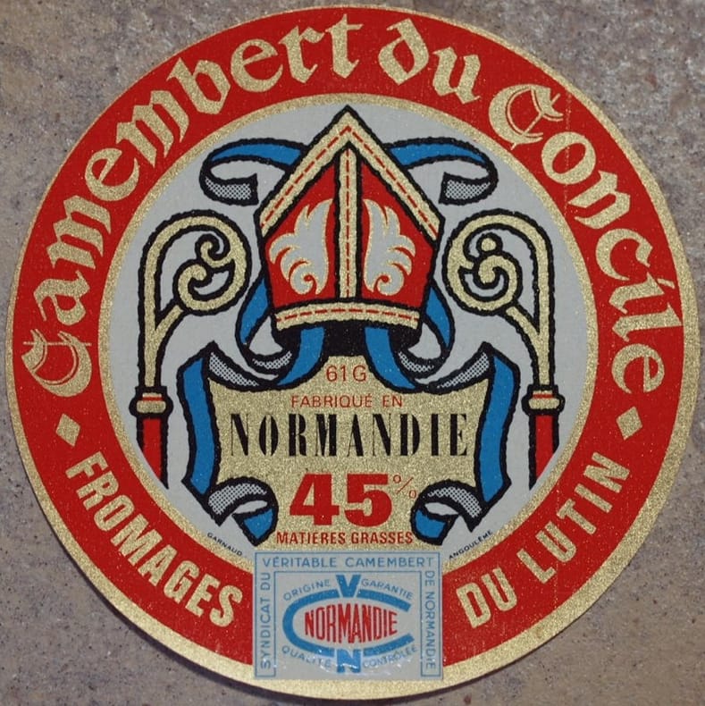 Bella etichetta del formaggio francese "Camembert du Concile". L'etichetta mostra uno stemma. In buone condizioni. Formato cm. 11,5x11,5. Beautiful luggage labels of the french cheese "Camamebert du Concile". The label show a mark. In good conditions.