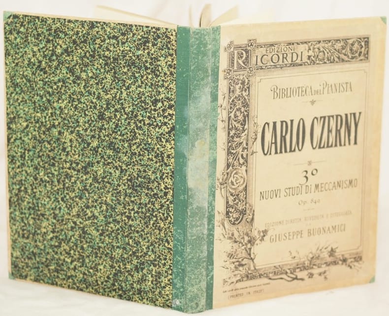 In 4. Dim. 30,5x23,5 cm. Pp. 85+53. Bella raccolta di due opere del compositore austriaco insegnante e pianista Carl Czerny (1791-1857). Czerny è noto per le opere di insegnamento di pianoforte, tuttora utilizzate. La prima opera sono quaranta esercizi dell'opera 299 per sviluppare l'agilità delle dita. Timbro a secco illeggibile ma della fine del XIX secolo. La seconda opera del 1895 sono trenta studi di meccanismo per pianoforte dell'opera 849 introduttivi all'opera 299. Edizione diretta, riveduta e diteggiata da Giuseppe Buonamici. Ritratto di Czerny. Note manoscritte. In buone condizioni e completo.Copertina in mezza tela con brossura applicata al piatto anteriore in buone condizioni con usure e macchie ai margini e dorso. Legatura in ottime condizioni. All'interno le pagine si presentano in buone condizioni con fioriture. Restauro marginale nelle pagg. 8, 9 della prima opera senza inficiare il testo. Beautiful collection of two works by the austrian composer teacher and piano player Carl Czerny (1791-1857). Czerny is famosu for his works used for piano teaching, still in use. The first work are 40 exercises of the opera 299 to develop agility in fingers. Unreadable embossed stamp but of the end of XIX century. The second work of 1895 are 30 studies of mechanism of piano of the work 849 introductive to the work 299. Edition directed, reviewed by Giuseppe Buonamici. Portrait of Czerny. Manuscripted notes. In good conditions and complete. Half cloth in good general conditions with wearings and stains in the edges and spine. Binding in very good conditions. Inside pages are in good conditions with foxings. Reastauration in the edges of pages 8, 9 of the first work without ruining the text.