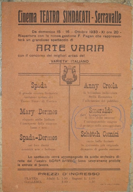 Bella locandina pubblicitaria del 15 e 16 ottobre 1933 del cinema Teatro Sindacati a Serravalle per lo spettacolo di numerosi artisti: Spada, Mary Dermes, Spada Dermes, Anny Creola, Smeraldo, Schetch Comici. Orchestra diretta dal Maestro Doria David. In ottime condizioni. Formato cm. 25x17,5. Beautiful advertising poster of the 15th and 16th of october 1933 of the cinema Teatro Sindacati in Serravalle for the exibition of different artists: Spada, Mary Dermes, Spada Dermes, Anny Creola, Smeraldo, Schetch Comici. Orchestra directed by Maestro Doria David. In very good conditions. Size cm. 25x17,5.