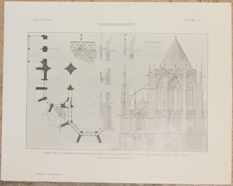 Bella litografia di architettura supplemento de "L'architecture" del 1905. La stampa mostra la Chiesa di Saint Urbain a Troyes (Aube). TECNICA: Litografia DIMENSIONI FOGLIO: cm 27,5x35,5 DIMENSIONI INCISIONE: cm 18x27,5 EPOCA: 1905 CONDIZIONI: Buone condizioni. Fioriture e strappi marginali. Beautiful lythography of 1905 taken from the work "L'architecture" of 1905. The print represents coloured glasses in Castle des Pins Canton de selles sur Cher (Loir et Cher). TECHNIQUE: Lythography PAGE SIZE: cm 27,5x35,5 PRINT'S SIZE: cm 18x27,5 PERIOD: 1905 CONDITION: good conditions. Foxings