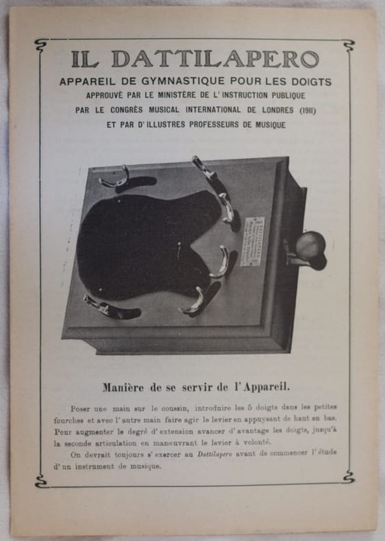In 8. Dim. 24,5x17,5 cm. Pp. (3). Interessante depliant pubblicitario dei primi anni del 1900 di uno strumento chiamato "dattilapero". Questo dispositivo prodotto a Pistoia serviva a far mantenere in allenamento le mani di musicisti quali violinisti e pianisti. Nel depliant la descrizione dello strumento, il suo utilizzo e alla fine lettere di elogio. Consta di 4 pagine di cui 3 scritte. In ottime condizioni. Copertina assente. Legatura in ottime condizioni. All'interno le pagine si presentano in ottime condizioni con rare fioriture. Piegatura orizzontale. Interesting advertising depliant of the first years of 1900 of an instrument called as "dattilapero". This tool produced in Pistoia was used to give a training for the fingers of musicians as violinists and piano players. In the depliant description of the instrument, its usage and letters of enthusiastic people at the end. In very good conditions. Cover is missing. Binding is missing. Inside pages are in very good conditions with occasional foxings. Horizontal folding.
