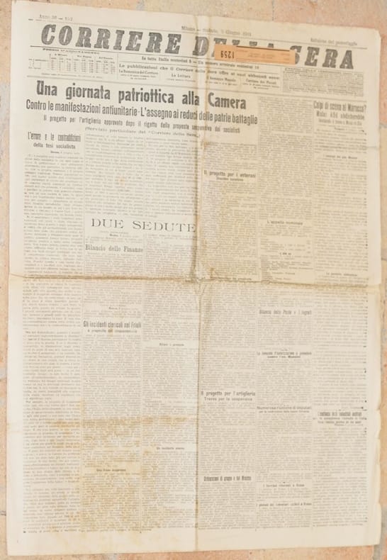 In folio. Dim. 59,5x43,5 cm. Pp. 8. Numero del 3 giugno 1911 di questo storico quotidiano italiano fondato a Milano nel 1876. Tra gli argomenti trattati: Una giornata patriottica alla Camera, Mulai Afid abdica in Marocco, L'organizzazione del raid Parigi Roma Torino, Salme dei generali di Crimea, Il monumento a Vittorio Emanuele sul Campidoglio, Frey ripartirà stamane da Pisa per Roma, Processo di Viterbo, Sport: Il duello Galetti Petit Breton sulle aspre strade pugliesi, La questione delle frodi sui Trams ecc.. Belle pubblicità. In buone condizioni. Raro. Brossura editoriale in buone condizioni generali con lievi usure ai margini e dorso. Piegature. All'interno le pagine si presentano in buone condizioni con rare fioriture. Piegature ed usure marginali. Number of the 3rd of June 1911 of this historical daily magazine established in Milan in 1876. Between the issues treated: A patriotic day in Camera, Mulai Afid in Morocco, Organization of raid Parigi Roma Torino, Dead bodies of generals of Crimea, The monument to Vittorio Emanuele on Campidoglio, Frey will leave tomorrow from Pisa to Rome, Trial of Viterbo, Sport: Galetti Petit Breton on the difficult streets in Puglia, Frauds in Trams etc.. Beautiful advertisings inside. In good conditions. Scarce copy. Editorial cover in good general conditions slightly worn in the edges and spine. Foldings and wearings. Inside pages are in good conditions with occasional foxings. Foldings.