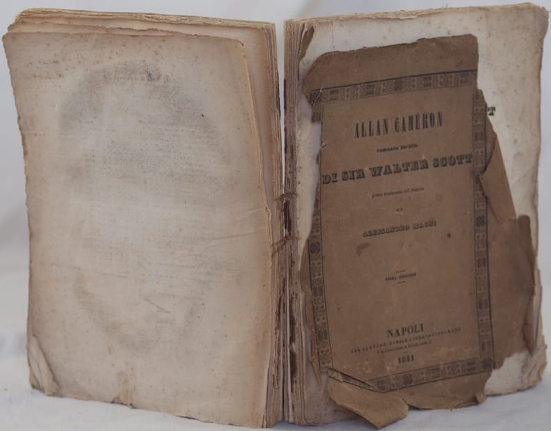 In 8. Dim. 25x18 cm. Pp. 178+(2). Prima edizione napoletana del 1841 del celebre romanzo di Walter Scott (1771-1832) poeta e scrittore scozzese nato ad Edimburgo e morto ad Abbotsford. Traduzione a cura di Alessandro Magni. L'opera è in un volume ed è completa, risulta mancante solo la prima carta bianca. In discrete condizioni. Brossura editoriale in mediocri condizioni generali con usure e parti mancanti ai margini e dorso. Piatto anteriore staccato con parti mancanti, dorso e piatto posteriore assente. Legatura in discrete condizioni. All'interno le pagine si presentano in buone condizioni con fioriture e usure marginali.First neapolitan edition of 1841 of the famous novel by Walter Scott (1771-1832) scottish poet and writer born in Edimburgh and dead in Abbotsford. Translation by Alessandro Magni. the work is in one volume and it is complete, only the first white page is missing. In fair conditions. Editorial cover in poor general conditions with wearings and missing parts in the edges and spine. Front plate detached with missing parts, spine and back plate missing. Binding in fair conditions. Inside pages are in good conditions with foxings and wearings in the edges.