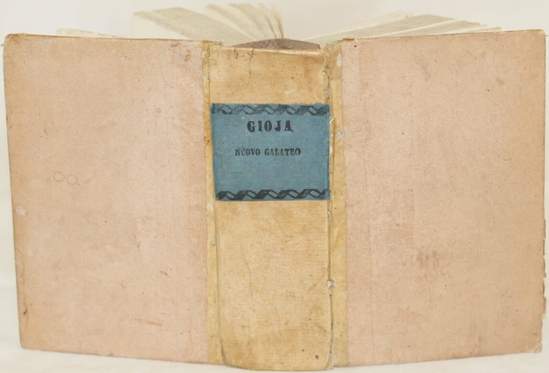 In 16. Dim. 17x11x6,5 cm. Pp. XV+344+VIII+480. Edizione del 1840 di questo raro volume di filosofia del celebre economista e storiografo Melchiorre Gioja (Piacenza 1767 - Milano 1829). Gioja prese parte attivamente al movimento risorgimentale italiano. L'opera è una moderna riscrittura dei trattati delle buone maniere il cui esempio più celebre è quello di Della Casa. Scritto nel 1802 a differenza di quest'ultimo Gioia non segue l'obiettivo della bellezza e dell'armonia estetica ma dell'utilità sociale. Per lui il galateo o "pulitezza" nei modi e nelle azioni ha il fine di rendere contenti se stessi e conquistare la stima del prossimo. Alla fine appendice con cenni sulla pirateria libraria. Opera completa di tutte le pagine. In discrete condizioni. In barbe. Copertina in pergamena con titolo al dorso in buone condizioni generali con usure ai margini e dorso. Segni di tarlo e rottura alle cerniere. Legatura in buone condizioni ma rottura alla prima carta bianca. All'interno le pagine si presentano in buone condizioni con rare fioriture. Le pagine dalla 96 alla 112 sono legate male. Edition of 1840 of this scarce volume of phylosophy of the famous economist and history writer Melchiorre Gioja (Piacenza 1767 - Milano 1829). Gioja took active part to the italian movement of risorgimento. The work is a modern rewriting of treaties of good manners of which the most famous is that of Della Casa. Written in 1802 Gioia differently by Della Casa did not follow estethic harmony and beauty but social utility. The aim Gioia perceives in good manners is to be happy of itselfand obtaining others estimation. At the end appendix with notes about book piracy. Work complete of all pages. In fair conditions. Uncut copy. Half parchment cover with title in the spine in good general conditions slightly worn in the edges and spine. Wormings and cracks in the spine. Binding in good conditions but crack in the first endpage. Inside pages are in good conditions with occasional foxings. Pages from 96 until 112 are badly bound.