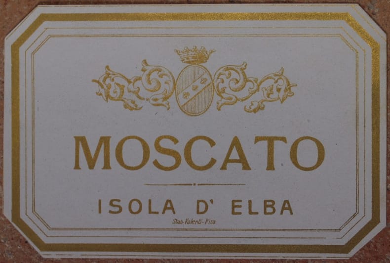 Bella etichetta degli anni '40/'50 del moscato dell'isola d'Elba. Belle decorazioni in oro. In ottime condizioni. Formato cm. 7,5x11,5 Beautiful label of Moscato wine produced in Elba Island. In good conditions. Size cm. 7,5x11,5.