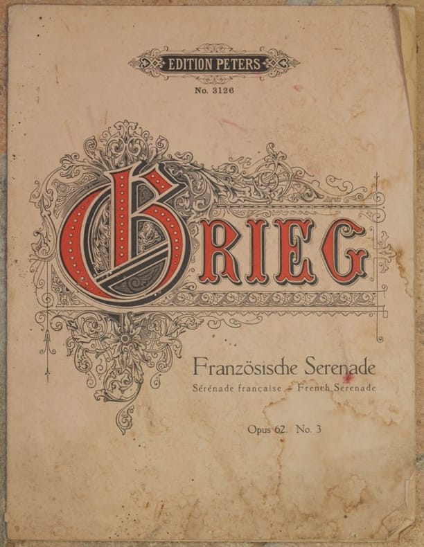 Bello spartito dei primi del '900, il pezzo per pianoforte "Serenade francaise" dall'opera 62 n. 3 di Edward Grieg Bel frontespizio figurato e copertina editoriale. In buone condizioni. Bruniture e macchie in copertina. Formato album cm. 30,5x23,5. Pp. 6. Beautiful musical score of the first years of 1900, "Serenade francaise" from the work 62 n. 3 of Edvard Grieg. Beautiful figurated title page and illustrated editorial cover. In good conditions. Stains in the cover. Size cm. 30,5x23,5. Pp. 6.<BR>
