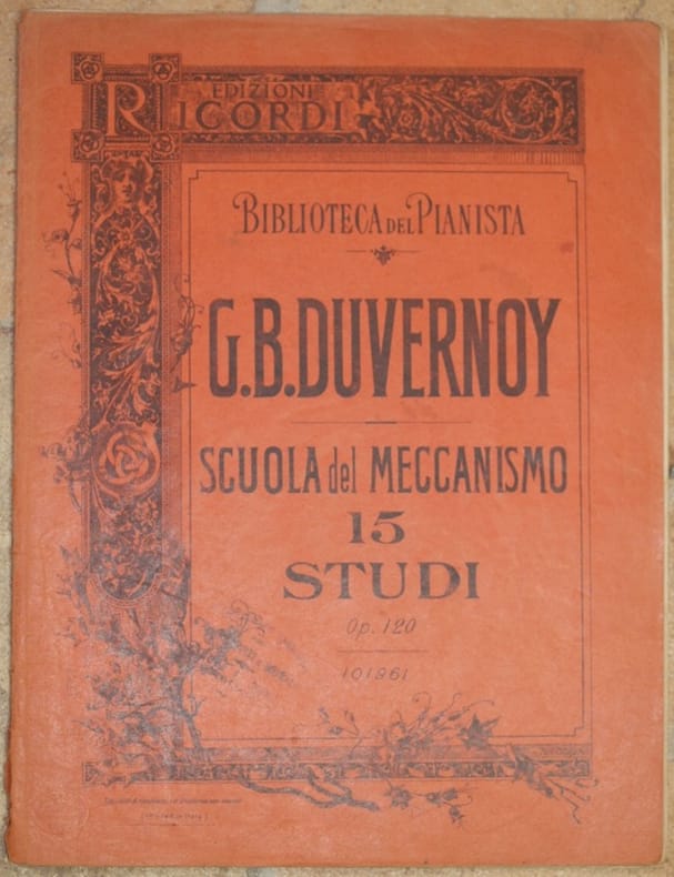 In 4. cm 31x23,5. Pp. 31. Edizione degli anni 1890 (timbro a secco Ricordi indica 189) di una raccolta di 15 studi di meccanismo per pianoforte. I pezzi provengono dall'opera 120 di Jean Baptiste Duvernoy (1802-1880) pianista e compositore francese. Insieme al volume un foglio manoscritto della seconda metà del '900 delle melodie "Polvere di stelle, Tu solamente tu, Lilì Marlen, Signorinella". Bella brossura editoriale in pieno stile liberty. Note manoscritte. In buone condizioni. Brossura editoriale in buone condizioni generali con lievi usure ai margini e dorso. Legatura quasi assente e corpo del libro staccato dalla copertina. All'interno le pagine si presentano in ottime condizioni con rare fioriture. Mende. Strappo orizzontale alla prima pagina. Edition of 1890's (Ricordi embossed stamp indicates 189) of a collection of 15 studies of mechanism for the study of piano. The pieces come from the work 120 by Jean Baptiste Duvernoy (1802-1880) french pianist and composer. Together with the volume a handwritten leaf of the second half of 1900 of melodies "Polvere di stelle, Tu solamente tu, Lilì Marlen, Signorinella". Beautiful editorial cover in full liberty style. Handwritten notes. In good conditions. Editorial cover in good general conditions slightly worn in the edges and spine. Binding is almost missing and the body of the book detached from the cover. Inside pages are in good conditions with occasional foxings. Usage signs.