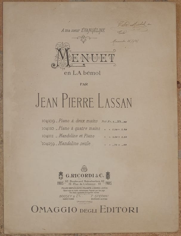 In 4. Dim. 34,5x26 cm. Pp. (3)+(1). Edizione senza data ma della fine del XIX secolo della melodia "Minuetto in La bemolle" di Jean Pierre Lassan per mandolino. Firma al frontespizio datata 1904. In ottime condizioni. Copertina editoriale in ottime condizioni generali con lievi usure ai margini e dorso. Legatura in ottime condizioni. All'interno le pagine si presentano in ottime condizioni con rare fioriture. Not dated edition but of the end of XIX century of the melody "Minuetto in La bemolle" by Jean Pierre Lassan for mandoline. Signature in title page dated 1904. In very good conditions. Editorial cover in very good general conditions slightly worn in the edges and spine. Binding in very good conditions. Inside pages are in very good conditions with occasional foxings. <BR>
