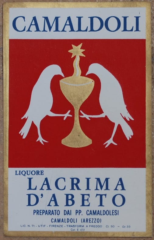 Bella etichetta del liquore "Lacrima d'abeto" prodotta dai Padri Camaldolesi a Camaldoli (Arezzo). Bella grafica. In buone condizioni. Formato cm. 10,5x6,5. Beautiful label of spirit "Lacrima d'abeto" produced by Padri Camaldolesi in Camaldoli (Arezzo). Beautiful graphic. In good conditions. Size cm. 10,5x6,5.