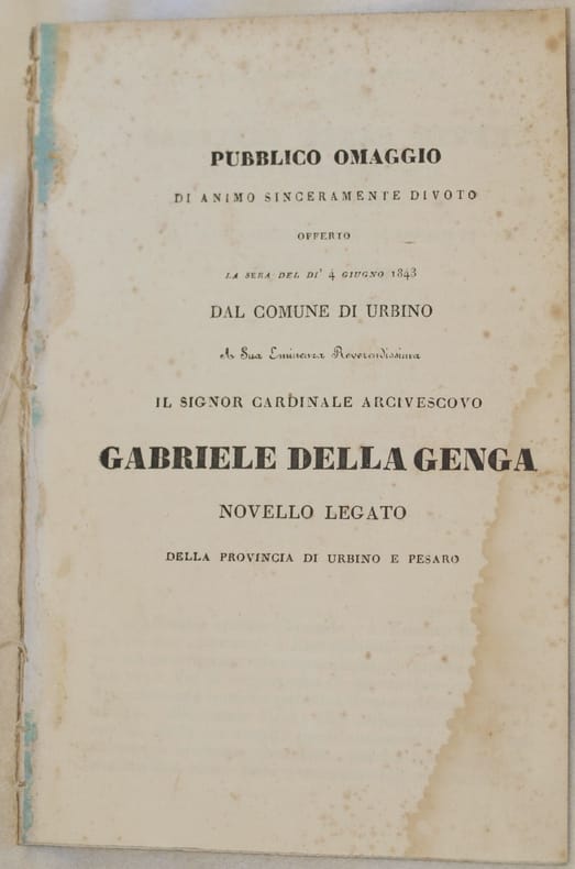 In 8. Dim. 19,5x13 cm. Pp. 18+(6). Interessante pubblicazione del 1843 di questo discorso di Gabriele della Genga (1801-1861) nato ad Assisi, Cardinale e Camerlengo del Sacro Collegio. Discorso letto in occasione della sua entrata a Urbino e Pesaro come legato apostolico. In buone condizioni e completo Copertina assente. Legatura quasi assente. All'interno le pagine si presentano in buone condizioni con fioriture a gore d'umidità marginali.Interesting pamphlet of 1843 of this speech of Gabriele della Genga (1801-1861) born in Assisi, Cardinal and Camerlengo of Sacro Collegio Speech read in occasion of his arrival in Urbino and Pesaro as papale legate. In good conditions and complete. Cover is missing. Binding is almost missing. Inside pages are in good conditions with foxings and waterstain in the edges.