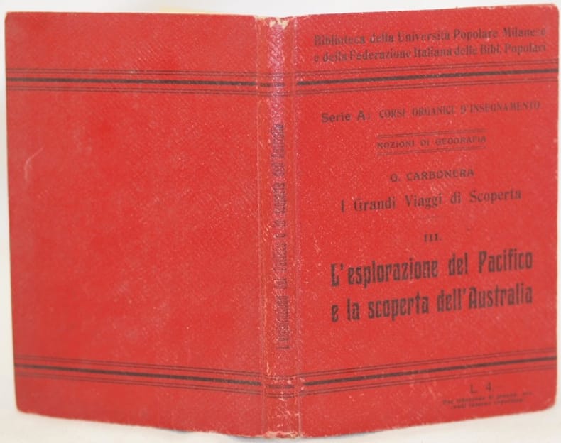 In 16. Dim. 16x11,5 cm. Pp. 124+(2). Edizione senza data ma degli anni '20 di questo volume della raccolta "I grandi viaggi di scoperta" n. 3. L'opera descrive l'esplorazione del Pacifico e la scoperta dell'Australia a cura del Prof. Giacinto Carbonera. All'interno alcune mappe e illustrazioni Tra gli argomenti trattati: Magellano, La Nuova Olanda, Inglesi nel Pacifico (corsari, Drake, Cavendish ecc..), Avventurieri e pirati (Walter Raleigh, Alla ricerca di El Dorado, Dampier, Isola di Robinson ecc..), Esplorazione scientifica (Cosacchi, stretto di Bering, Bougainville, Cook), Oceania (Nuova Zelanda), La Perouse ecc... In ottime condizioni. Copertina cartonata editoriale in ottime condizioni generali con lievi usure ai margini e dorso. Legatura in buone condizioni. All'interno le pagine si presentano in buone condizioni con rare fioriture. Not dated edition of 1920's of this volume of the collection "I grandi viaggi di scoperta" n. 3. The work describes the exploration of Pacific Sea and discovery of Australia by Prof. Giacinto Carbonera. Some maps and illustrations inside Between the issues treated: Magellano, New Holland, English i Pacific Sea (pirates, Drake, Cavendish ecc..), Advernturers and pirates (Walter Raleigh, Looking for El Dorado, Dampier, Robinson Island ecc..), Scientiphic exploration (Cosacchi, stretto di Bering, Bougainville, Cook), Oceania (New Zealand), La Perouse etc... In very good conditions. Editorial carton cover in very good general conditions slightly worn in the edges and spine. Binding in good conditions. Inside pages are in good conditions with occasional foxings.