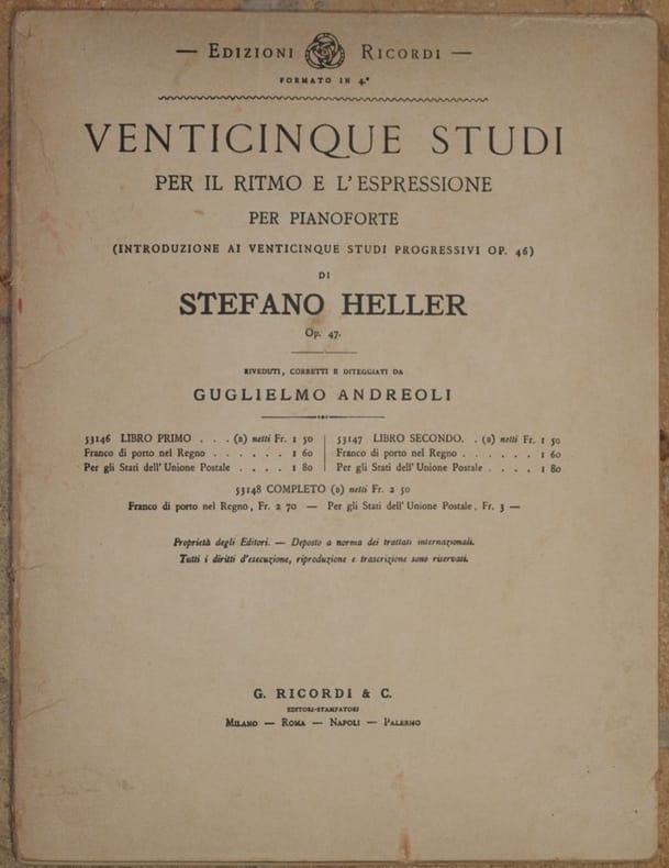In 4. cm 31x23,5. Pp. 47. Edizione Ricordi dell'Agosto 1908 di una raccolta di 25 studi per il ritmo e l'espressione per pianoforte (Introduzione ai venticinque studi progressivi op. 46) del pianista e compositore ungherese Stephen Heller (1813-1888). Note manoscritte. In buone condizioni e completo ma privo di copertina. Copertina mancante. Legatura quasi assente. All'interno le pagine si presentano in ottime condizioni con rare fioriture. Mende. Alcune piegature agli angoli. Strappo alla prima pagina. Ricordi edition of August 1908 of a collection of 25 studies for rythm and expression for piano (Introduction to 25 progressive studies op. 46) by the hungharian piano player and composer Stephen Heller (1813-1888). Handwritten notes. In good conditions and complete but boundless. Cover is missing. Binding is almost missing. Inside pages are in good conditions with occasional foxings. Usage signs. Some foldings in corners. Tear in the first page.