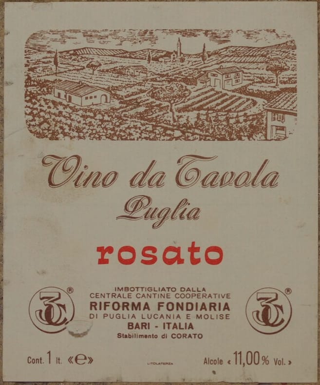Bella etichetta del vino da tavola di Puglia prodotto dalla Centrale Cantine cooperative Riforma Fondiaria. Bella illustrazione che mostra una veduta di Corato (Bari). In buone condizioni, piccolo strappo. Formato cm. 13x11.Beautiful label of wine of Puglia produced by Centrale Cantine cooperative Riforma Fondiaria. Beautiufl illustration showing a view of Corato (Bari). In good conditions.