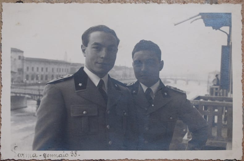 Bella fotografia che mostra due militari italiani. Nota manoscritta Parma gennaio 1938. Alcune parti di carta applicate al verso. In buone condizioni. Foto dim. 9,5x14,5. Beautiful photo showing two italian soldiers. Handwritten note Parma january 1938. Some parts of paper applied in verso. In good conditions.