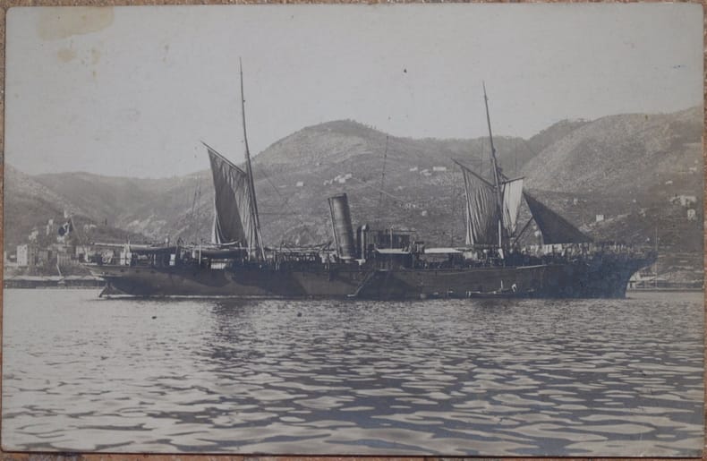 Fotografia all'albumina della nave Crocodile nel Canale di Suez. Nota manoscritta al verso. Senza data ma di fine ottocento. Dim. Foto cm 28x21,5. Albumine photo of the ship Crocodile in Suez channel. Handwritten note in the verso. Not dated but of late 19th century Dim. Foto cm 28x21,5