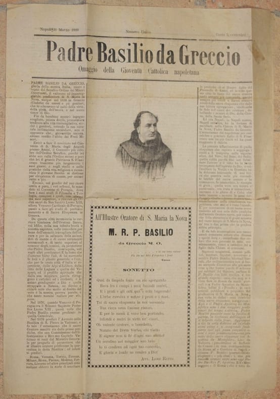 In folio. Dim. 48,5x35 cm. Pp. (4). Interessante pubblicazione del Padre Basilio da Greccio. Numero del 31 Marzo 1889 omaggio della Gioventu Cattolica napoletana. Vita del religioso e sonetto a lui dedicato scritto dall'Avvocato Luigi Ruffo. Ritratto alla prima pagina. In buone condizioni. Copertina editoriale in buone condizioni generali con lievi usure e strappetti ai margini. Legatura in buone condizioni. All'interno le pagine si presentano in buone condizioni con rare fioriture. Piegature. Interesting pamphlet about the Father Basilio da Greccio. Number of the 31st of March 1889 gift of Gioventu Cattolica napoletana. Life of the religious man and sonnets dedicated to him written by Luigi Ruffo. Portrait in the first page. In good conditions. Editorial cover in good general conditions slightly worn and wearings in the edges and spine. Binding in good conditions. Inside pages are in good conditions with occasional foxings. Foldings.