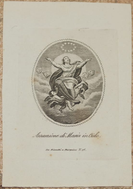 Bella xilografia del 1870 circa, un'immaginetta che rappresenta L'Assunzione di Maria in cielo. Carta fine. INCISIONE: Xilografia DIMENSIONI FOGLIO: cm 11x7,5 DIMENSIONI INCISIONE: cm 7,5x6 EPOCA: 1870 circa CONDIZIONI: Ottime condizioni. Fioriture Very fine steel print of 1870 circa, an holy image of Assumption of Mary. Thin paper. TECHNIQUE: steel print PAPER SIZE: cm 11x7,5 PRINT SIZE: cm 7,5x6 PERIOD: 1870 circa CONDITIONS: very good conditions. Foxings