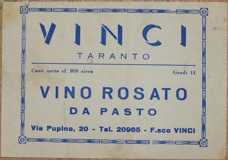 Bella etichetta del vino Vinci di Taranto. In buone condizioni. Formato cm. 8,5x12,5. Beautiful label of Vinci wine of Taranto. In good conditions. Size cm. 8,5x12,5.