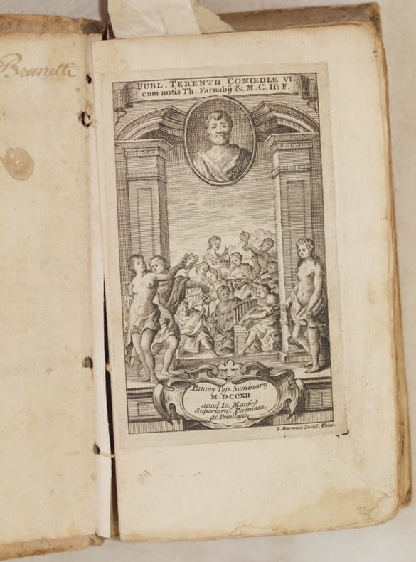 In 16. Dim. 18x10 cm. Pp. (24)+414+(6). Edizione del 1712 di questa raccolta di commedie di Publio Terenzio Afro commediografo berbero di lingua latina attivo a Roma dal 166 a.c. al 160 a.c.. Publio Terenzio fu uno dei primi autori latini a introdurre il concetto di humanitas, elemento caratterizzante del "Circolo degli scipioni". Testo in lingua latina con note a cura di Thomas Farnaby (1575-1647). All'interno sono presenti le seguenti commedie: L'Andria, Gli Eunuchi, Gli Adelfi, Il Formione, L'Heautonti-Morumenos, L'ecira. Dissertazione a cura del filologo olandese Daniel Heinsius (1580-1655). Vita di Terenzio a cura di Elio Donato. In discrete condizioni ma completo. Bel frontespizio figurato inciso da Baronus. Firma di appartenenza datata 1653 alla prima carta bianca Copertina cartonata coeva con titolo manoscritto al dorso in discrete condizioni generali con usure e parti mancanti ai margini e dorso. Legatura in mediocri condizioni con rotture e pagine staccate. All'interno le pagine si presentano in buone condizioni con fioriture. Piccolo foro a pag. 33 con piccola perdita di testo. Edition of 1712 of this collection of plays by Publio Terenzio Afro playwriter of latin language living in Rome from 166 b.c. until 160 a.c. Publio Terenzio was one of the first latin authors to introduce the concept of humanitas, element carachterizing the "Circolo degli scipioni". Text in latin language with notes by Thomas Farnaby (1575-1647). Insdie there are the following plays: L'Andria, Gli Eunuchi, Gli Adelfi, Il Formione, L'Heautonti-Morumenos, L'ecira. Dissertation by the dutch phylologue Daniel Heinsius (1580-1655). Life of Terenzio by Elio Donato. In fair conditions but complete. Beautiful figurated title page engraved by Baronus. Signature dated 1653 in the first blank page. Carton coeval cover with handwritten title in the spine in fair general conditions with wearings and missing parts in the edges and spine. Binding in poor conditions with cracks and pages detached. Inside pages are in good conditions with foxings. Little hole in pag. 33 with slight loss of text.