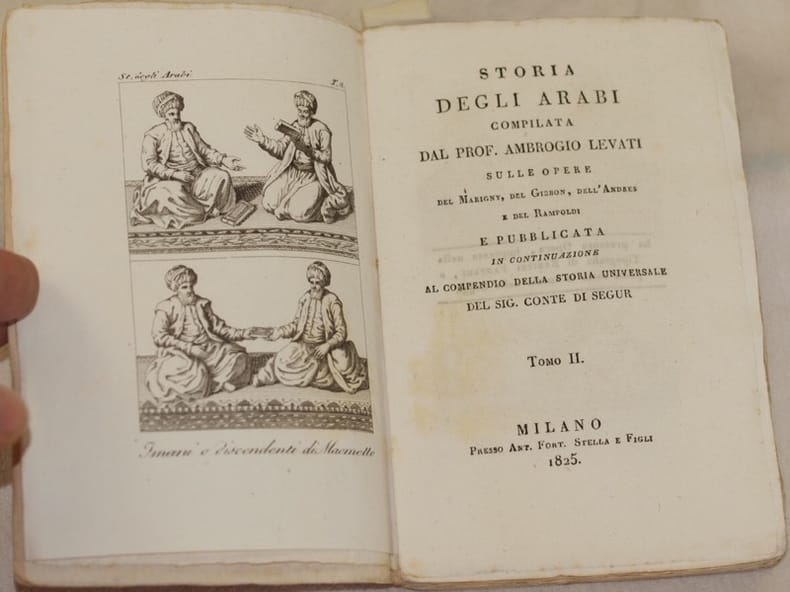 In 16. Dim. 15,5x10 cm. Pp. 207+(1), 216, 238+(2). Edizione del 1825 di questa opera sulla storia degli arabi scritta dal Prof. Ambrogio Levati della collana "Compendio della storia universale di Segur". L'opera è composta da tre tomi ed è completa. All'interno nove belle incisioni fuori testo (moschea o sepolcro di Mao, Imami o discendenti di Maometto, I primi quattro Califfi, Guerrieri Arabi, Donne Arabe, uomini arabi, accampamento di beduini ecc.) delle quali una in ogni antiporta. In barbe. In ottime condizioni e completa. Copertina editoriale in ottime condizioni generali con lievi usure ai margini e dorso. Legatura in buone condizioni. All'interno le pagine si presentano in ottime condizioni con rare fioriture. Edition of 1825 of this work about the history of arabian people written by Prof. Ambrogio Levati of the series "Compendio della storia universale di Segur". The work is made up of three tomes and it is complete. inside nine beautiful out of text prints (mosque or Mao grave, Imami or discendants of Mahomet, The first four Califfi, Arabian warriors, Arabian women, arabian men, beduins ecc.) of wich one is in the frontspice. Uncut copy. In very good conditions and complete. Editorial cover in very good general conditions slightly worn in the edges and spine. Binding in good conditions. Inside pages are in very good conditions with occasional foxings.