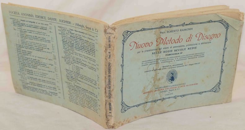 In 8. Dim. 17,5x25 cm. Pp. 151. Edizione del 1938 di questo interessante volume di disegno per la preparazione degli esami di abilitazione alle scuole medie scritto dal Prof. Roberto Raimondi. Fascicolo IV solamente. All'interno sono presenti 67 planches in bianco e nero e colorate per imparare a disegnare elementi di geometria, architettura (stili e proiezioni), Disegni geografici, copie dal vero, composizioni decorative adatti per ceramiche, intarsi, ricami ecc.... Breve testo esplicativo e spiegazione per ogni planche. In buone condizioni e completo. Copertina editoriale in mediocri condizioni generali con usure ai margini e dorso. Macchie. Legatura in discrete condizioni con rotture. All'interno le pagine si presentano in buone condizioni con rare fioriture.Edition of 1938 of this interesting volume of drawing for preparation of examination to secondary schools written by Prof. Roberto Raimondi. Pamphlet IV only Inside there are 67 black and white and coloured planches to learn drawings of geometry, architecture (styles and projections), geogrpahical drawings, copies from truth, decorative compositions for ceramics, embroidery etc.... Brief text and explanation for each planche. In good conditions and complete. Editorial cover in poor general conditions with wearings in the edges and spine. Stains. Binding in fair conditions with cracks. Inside pages are in good conditions with occasional foxings.