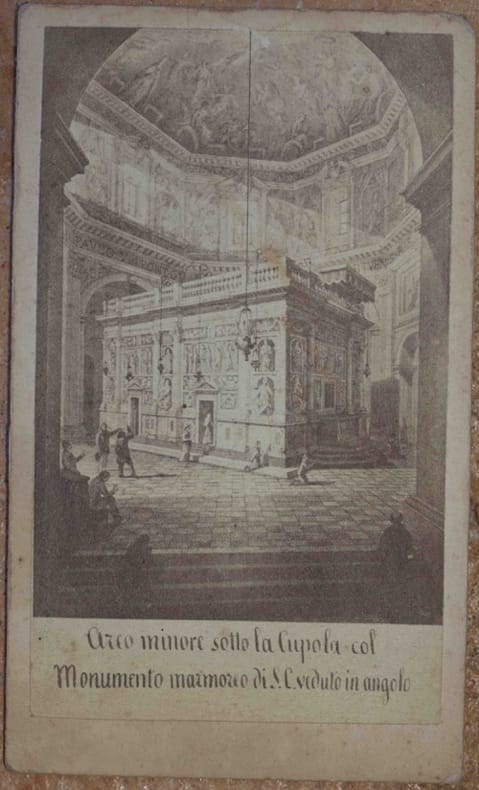 Bella fotografia all'albumina della fine del XIX secolo che mostra l'interno di una Chiesa e diversi fedeli. La foto è applicata su cartoncino coevo. In buone condizioni, fioriture, mende. Dim. cartone cm 10,5x6,5. Dim. foto cm 9,5x5,5. Very beautiful albumine photo of the end of XIX century showing the internal part of a church with faithful people. The photo is applied on coeval carton base. In good conditions, foxings and usage signs, missing parts in the carton base. Dim. carton cm 10,5x6,5. Dim. photo cm 9,5x5,5