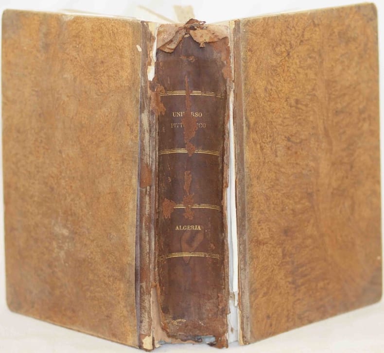 Antonelli, Venezia, 1853. In-8 p. (mm. 220x142), 3 opere in 1 volume, mz. pelle coeva (piatti con mancanze), fregi e tit. oro al dorso. L'opera, con testo su due colonne, molto ben illustrata da complessive 27 (su 35) tavole inc. in rame (poste alla fine del volume), è così composta:- "Algeria" di Carette E., pp. (6),355 (incluso l'Indice), con 1 cartina geografica, ripieg., relativa all'Algeria del 1849 e 6 tavv. di vedute. Mancano le prime 32 pagg. dedicate ad Algeri di Rozet P. con le relative 8 tavole.- "Reggenza di Tripoli" di Hoefer F., pp. 144 (incluso l'Indice), con 1 cartina geografica, ripieg., che rffigura Algeria. Impero di Marocco, Reggenze di Tunisi e Tripoli, 1845, e 1 bella tavola con la veduta dell'arco di Marco Aurelio a Tripoli.- "Reggenza di Tunisi" di Frank L, riveduta e corredata di un compendio cronologico e di illustrazioni desunte dagli scrittori orientali da Marcel G.G., pp. 252 (inclusa l'Appendice dedicata alla descriz. delle monete di Tunisi, e l'Indice), con 18 tavv. che raffigurano usi e costumi, vedute e monumenti di: Tunisi, Marocco, Barberia, monete di Tunisi.Volume della Collana L'Universo o Storia e descrizione di tutti i popoli, loro religioni, costumi ed usanze, ecc..Esemplare ben conservato.