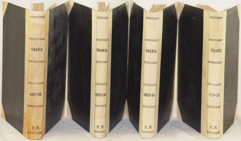 In 8. Dim. 24x17,5 cm. Pp. 48+214+238, 40+227+232, 196+224, 278+206. Kg. 3,00 Bella raccolta di otto annate dal 1931 al 1938 della rivista scientifica bimestrale "Urania" con notizie di astronomia, metereologia, geologia, mineralogia, chimica e fisica Tra gli articoli presenti: Dal sistema solare all'Universo Siderale, notiziario di astronomia, Marte 1659-1929, La meteorologia, Geologia, Dagli atomi agli astri, Notiziario di mineralogia, Elettricità ed energia, Elettroni ed elettricità, Maree terremoti e macchie solari, I raggi ultravioletti, La conoscenza dell'universo, Trattato di astronomia siderale (parte III stelle) di Giuseppe Armellini, Cos'è l'elettricità, Etere ed elettroni, Le nuove ricerche sull'età dell'Universo, Macchie solari, La moderna mineralogia nel quadro delle scienze fisiche chimiche e geologiche, I metalli negli Esseri viventi, L'ottica e l'astronomia, L'astronomia stellare prima del secolo XIX, Galvani la rana la radio, Fantasticando sulle origini dell'Universo, Influenze sulle macchie solari sulla Terra, Elettrizzazioni e radiazioni del corpo umano ecc... Qualche illustrazioni e planches all'interno tra cui la fotografia della Cometa di Halley eseeguite nell'Osservatorio Cerulli in Teramo Brossura di ogni primo numero conservata all'interno. In buone condizioni e completi Copertina in mezza tela con titolo al dorso in buone condizioni generali con lievi usure ai margini e dorso. Dorso dell'annata 1937-38 quasi del tutto staccata. Legatura in buone condizioni con lievo rotture. All'interno le pagine si presentano in buone condizioni con rare fioriture. Beautiful collection of eight years of the scientiphic bemonthly magazine "Urania" from the year 1931 until 1938. The magazine contained information of astronomy, metereology, geology, mineralogy, chemistry and physics. Between the articles inside: From solar system to Sideral Universe, information of astronomy, Mars 1659-1929, Meteorology, Geology, From atoms to stars, Information of mineralogy, Electricity and energy, Electricity, Earthquakes and sun stains, Ultraviolet rays, Knowledge of Universe, Treaty of sideral astronomy (part III stars) by Giuseppe Armellini, What electricity is, Electrons, The new researches about age of universe, Sun stains, Modern mineralogy in the frame of physical, chemical and geological sciences, The metals of beings, Optic and astronomy, Star astronomy before XIX century, Galvani the frog the radio, Wondering about the origins of universe, Influences about sun stains of earth, Radiations of human bodies ecc... Some illustrations and planches inside between them the Star of Halley made in Cerulli Observatory in Teramo. Editorial cover of each first number preserved inside. In good conditions and complete. Half cloth cover with title in the spine in good general conditions slightly worn in the edges and spine. SPine of the year 1937-38 almost totally detached. Binding in good conditions with slight cracks. Inside pages are in good conditions with occasional foxings.