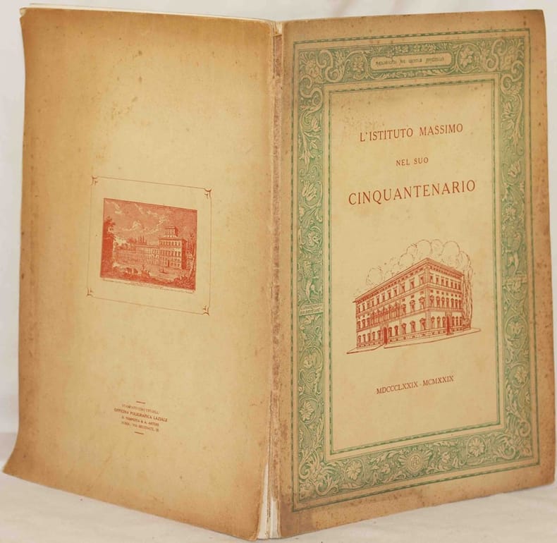 In folio. Dim. 34,5x25 cm. Pp. 84. Interessante pubblicazione del 1930 edita in occasione del cinquantenario dalla fondazione dell'Istituto Massimo (1879-1929). L'istituto venne fondato nel 1879 da Massimiliano Massimo (1849-1911) figlio del Principe Vittorio Emanuele. L'istituto sorse all'interno del palazzo di famiglia Villa Peretti Montalto e divenne scuola elementare e liceo privato Testo e disegni a cura di Luigi Biacchi, Luigi Montresor, Giovanni Poli e degli ex allievi Ernesto Rinaldi, Diego Angeli, Achille Bertini Calosso, Mario Cingolani, Renzo Cinotti, Auro D'Alba, Silvio D'Amico, Ferdianndo D'Ardia Caracciolo, Giovanni Faure, Arnaldo Frateili, Enzo Frateili, Saverio Kambo, Nicola Lardi, Giuseppe Massaruti, Federico Mastrigli, Roberto Paribeni, Costantino Parisi, Raffaello Santarelli. All'interno parte dedicata al fondatore, gite scolastiche (Ostia, Vesuvio, Genova), insegnanti, Inno, teatro, la guerra, Lourdes ecc... Numerose foto d'epoca. In buone condizioni. Copertina editoriale in buone condizioni generali con lievi usure ai margini e dorso. Legatura in discrete condizioni con lievi rotture. All'interno le pagine si presentano in buone condizioni con fioriture. Interesting pamphlet of 1930 edited in occasion of fifty years from establishment of Istituto Massimo (1879-1929). The institute was established in 1879 by Massimiliano Massimo (1849-1911) son of the Prince Vittorio Emanuele. The institute was established inside the family palace Villa Peretti Montalto and became primary and secondary school. Text and drawings by Luigi Biacchi, Luigi Montresor, Giovanni Poli e degli ex allievi Ernesto Rinaldi, Diego Angeli, Achille Bertini Calosso, Mario Cingolani, Renzo Cinotti, Auro D'Alba, Silvio D'Amico, Ferdianndo D'Ardia Caracciolo, Giovanni Faure, Arnaldo Frateili, Enzo Frateili, Saverio Kambo, Nicola Lardi, Giuseppe Massaruti, Federico Mastrigli, Roberto Paribeni, Costantino Parisi, Raffaello Santarelli. Inside part dedicated to the establisher, school travels (Ostia, Vesuvio, Genova), teachers, Hymn, Theatre, war, Lourdes ecc... Different photoes of that time. In good conditions. Editorial cover in good general conditions slightly worn in the edges and spine. Binding in fair conditions with slight cracks. Inside pages are in good conditions with foxings.
