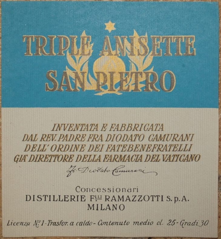 Bella etichetta del liquore Triple Anisette San Pietro imbottigliato dalle distillerie F.lli Ramazzotti di Milano. Bella grafica. In buone condizioni. Formato cm. 8x7,5. Beautiful label of Montresor wine produced by Triple Anisette San Pietro bottled by wine producers F.lli Ramazzotti in Milan. Beautiful graphic. In good conditions.