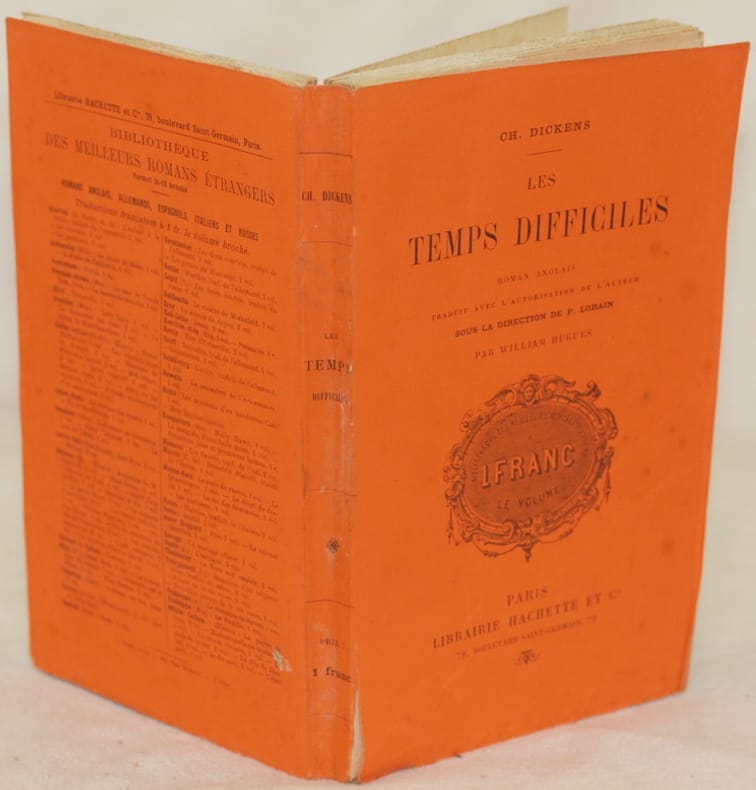 In 8. Dim. 19x12 cm. Pp. 330. Edizione francese del 1901 del celebre romanzo Hard Times (Tempi difficili) dello scrittore Charles Dickens (1812-1870). Traduzione con l'autorizzazione dell'autore sotto la direzione di Lorain a cura di William Hugues L'opera è in un volume ed è completa. In ottime condizioni. Copertina editoriale in ottime condizioni generali con lievi usure ai margini e dorso. Legatura in buone condizioni. All'interno le pagine si presentano in ottime condizioni con rare fioriture, ancora unite tra loro. French edition of 1901 of ths famous novel Hard Times (Tempi difficili) by the writer Charles Dickens (1812-1870). Translation with authorization of the author under the direction of Lorain by William Hugues. The work is in one volume and it is complete. In very good conditions. Editorial cover in very good general conditions slightly worn in the edges and spine. Binding in good conditions. Inside pages are in very good conditions with occasional foxings, still bound together.
