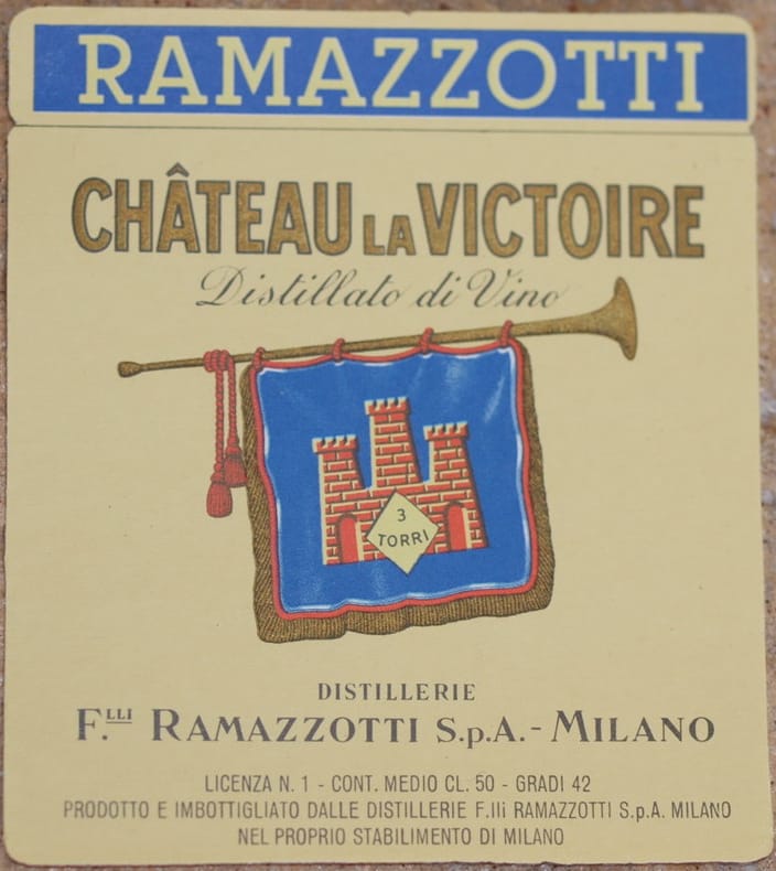 Bella etichetta del distillato di vino "Chateau la victoire" prodotto da Ramazzotti. In buone condizioni. Formato cm. 9x8. Beautiful label of "Chateau la victoire" wine produced by Ramazzotti. In good conditions.