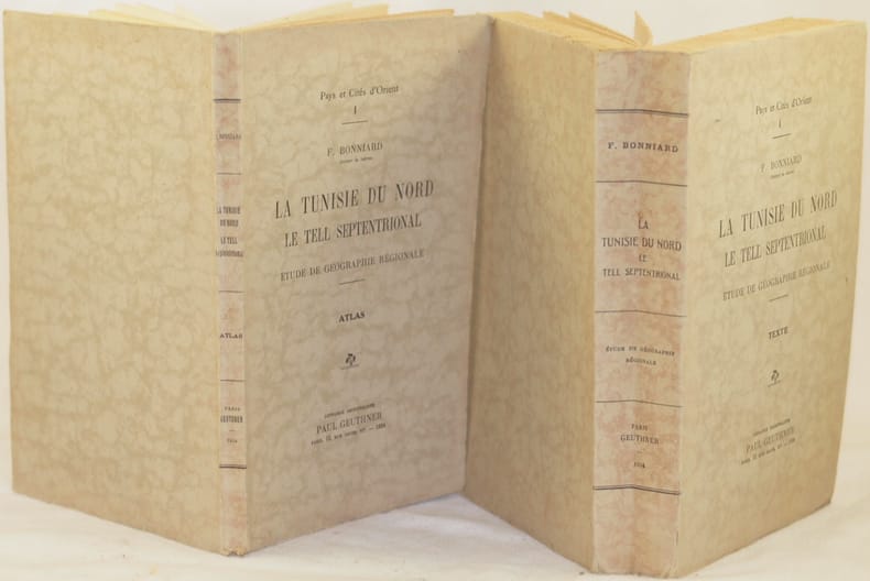 In 8. Dim. 25,5x16,5 cm. Pp. 534+(2), XIII+(3)+88+3. Peso Kg. 1,242. Edizione del 1934 di questo interessante studio geografico della Tunisia del Nord scritto da Bonniard della collana "Pays et Citès d'Orient". L'opera è composta da due voumi uno di testo l'altro un atlante con le planches e carte ed è completo. Tra gli argomenti trattati: Struttura del tell settentrionale (aspetti del terreno, caratteri strutturali, formazione), Morfologia del Tell settentrionale (condizioni attuali, evoluzione idrografica, piani della Medjerda media, litorali), Clima, Conseguenze del suolo e del clima (idrografia, uomo), Popolazioni indigene, Europei (opera di colonizzazione, porto di Bizerte) ecc... In ottime condizioni e completo. Copertina editoriale in ottime condizioni generali con lievi usure ai margini e dorso. Legatura in ottime condizioni. All'interno le pagine si presentano in ottime condizioni con rare fioriture, nell'atlante ancora unite tra loro. Edition of 1934 of this interesting geographycal study about Tunisia of North written by Bonniard of the series "Pays et Citès d'Orient". The work is made up of two volume, one is texte, the other one the atlas and it is complete. Between the issues treated: Structure of northern tell (aspects of soil, structural carachters, formation), Morphology of northern Tell (conditions, hydrographic evolution, plans of middle Medjerda coasts), Climate, Consequences of sole and climate (hydrography, man), local people, Europeans (work of colonization, harbour of Bizerte) etc... In very good conditions and complete. Editorial cover in very good general conditions slightly worn in the edges and spine. Binding in very good conditions. Inside pages are in very good conditions with occasional foxings, in the atlas still bound together.