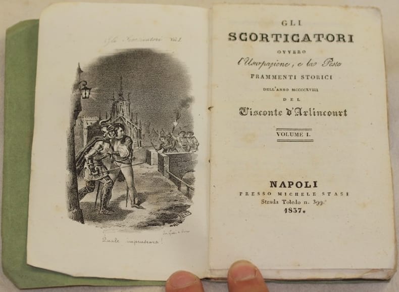 In 16. Dim. 14,5x9 cm. Pp. 251+(1). Edizione del 1837 di questo romanzo storico scritto da Charles Victor Prevot Arlincourt (1789-1856). L'opera era composta da due volumi, siamo purtroppo in possesso solo del primo tomo. Incisione litografica in antiporta. In buone condizioni Copertina editoriale in buone condizioni generali con lievi usure ai margini e dorso. Legatura in buone condizioni. All'interno le pagine si presentano in ottime condizioni con rare fioriture. Edition of 1837 of this historical novel written by Charles Victor Prevot Arlincourt (1789-1856). The work was made up of two tomes, unfortunately we only have the first tome. Lytographic print in the frontspice. In good conditions. Editorial cover in very good general conditions slightly worn in the edges and spine. Binding in good conditions. Inside pages are in very good conditions with occasional foxings.