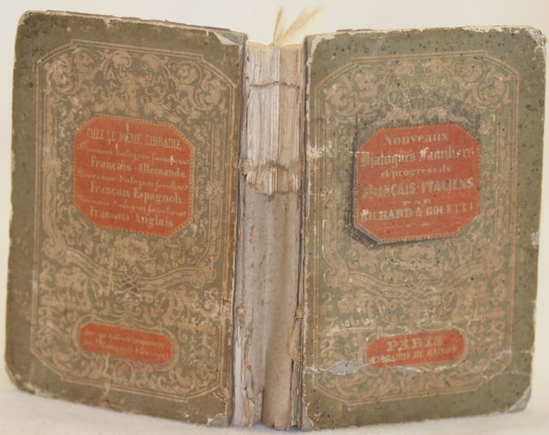 In 24. Dim. 13x8,5 cm. Pp. (4)+350. Interessante raccolta di dialoghi francesi italiani ad uso di viaggiatori o di coloro che intendono studiare l'italiano scritto da Richard e Boletti. Il volume contiene dialoghi di uso quotidiano e vocabolario domestico (rimedi piu usati, vetture). Senza data ma del 1870 circa. In discrete condizioni. Copertina cartonata in mediocri condizioni generali con usure ai margini e dorso mancante. Legatura in mediocri condizioni con rotture. All'interno le pagine si presentano in buone condizioni con fioriture. Piccole lievi gore d'umidità marginali. Interesting collection of french and italian dialogues for the usage of travellers or people who want to study italians written by Richard and Boletti. The volume contains dialogues of daily usage and house vocabulary (most used remedies, cars) Not dated but of 1870 circa. In fair conditions. Carton cover in poor general conditions with wearings in the edges and spine missing. Binding in poor conditions with cracks. Inside pages are in good conditions with foxings.