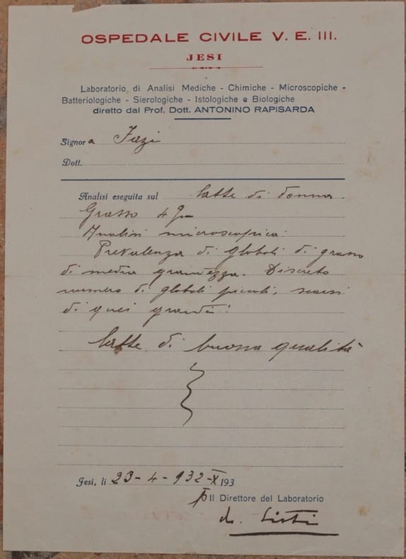 Interessante documento del 23 aprile 1932, un referto di analisi su latte materno eseguito all'ospedale civile di Jesi. In buone condizioni, piegature. Piccoli fori e parti mancanti. In 8. Dim. cm 22x16. Interesting document of the 23rd of april 1932, a result of analysis of woman milk made in the civil hospital of Jesi.In good conditions, foldings. Little holes. In 8. Dim. cm 22x16.