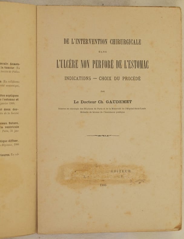In 8. Dim. 25,5x16,5 cm. Pp. 123+(5). Raro studio del 1906 sull'intervento chirurgico nell'ulcera non perforata dello stomaco scritta da Ch. Gaudemet. L'autore fornisce una serie di indicazioni sulle scelte, il tipo di intervento da eseguire e le tecniche da utilizzare. Numerose illustrazioni all'interno. Note manoscritte. In discrete condizioni. Copertina assente. Legatura in discrete condizioni con rotture. All'interno le pagine si presentano in buone condizioni con fioriture. Scarce study of 1906 about surgical intervention in perforated gastric ulcer written by Ch. Gaudemet. The author indicates a series of indications about choices, the kind of intervention, the techniques. Different illustrations inside. Hand written notes. In fair conditions Cover is missing. Binding in fair conditions with cracks. Inside pages are in good conditions with foxings.