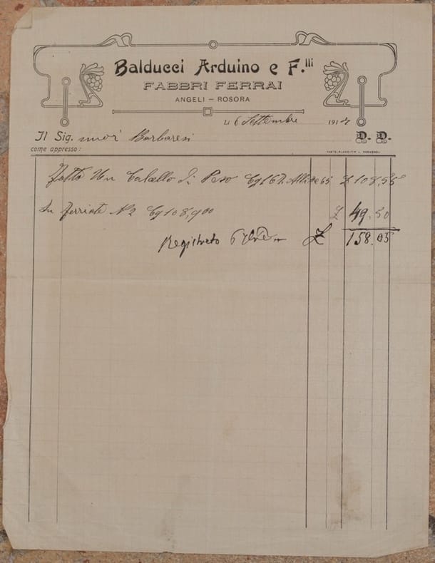 Bella fattura del 1914 la fattura della ditta Balducci Arduino e F.lli fabbri Ferrai. In buone condizioni, piegature. Dim. cm 27x21. Beautiful letter of 1914 the invoice of the firm Balducci Arduino e F.lli fabbri Ferrai. In good conditions, foxings.